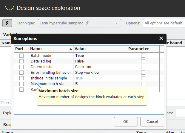 При работе с методами планирования эксперимента в пакетном режиме теперь можно задать длину пакета точек. Если режим включен и задана опция Maximum batch size, блок разобьет итоговую выборку на пакеты и будет выдавать их по одному. Если режим включен, но опция не задана, полная выборка будет выдана одним пакетом, как ранее.