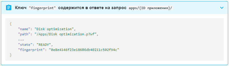 REST-клиент к AppsHub-приложению теперь может проверить, что приложение в AppsHub не изменялось. Для этого в REST API добавлен ключ "fingerprint"; его значение - уникальный идентификатор, который меняется при любом изменении приложения